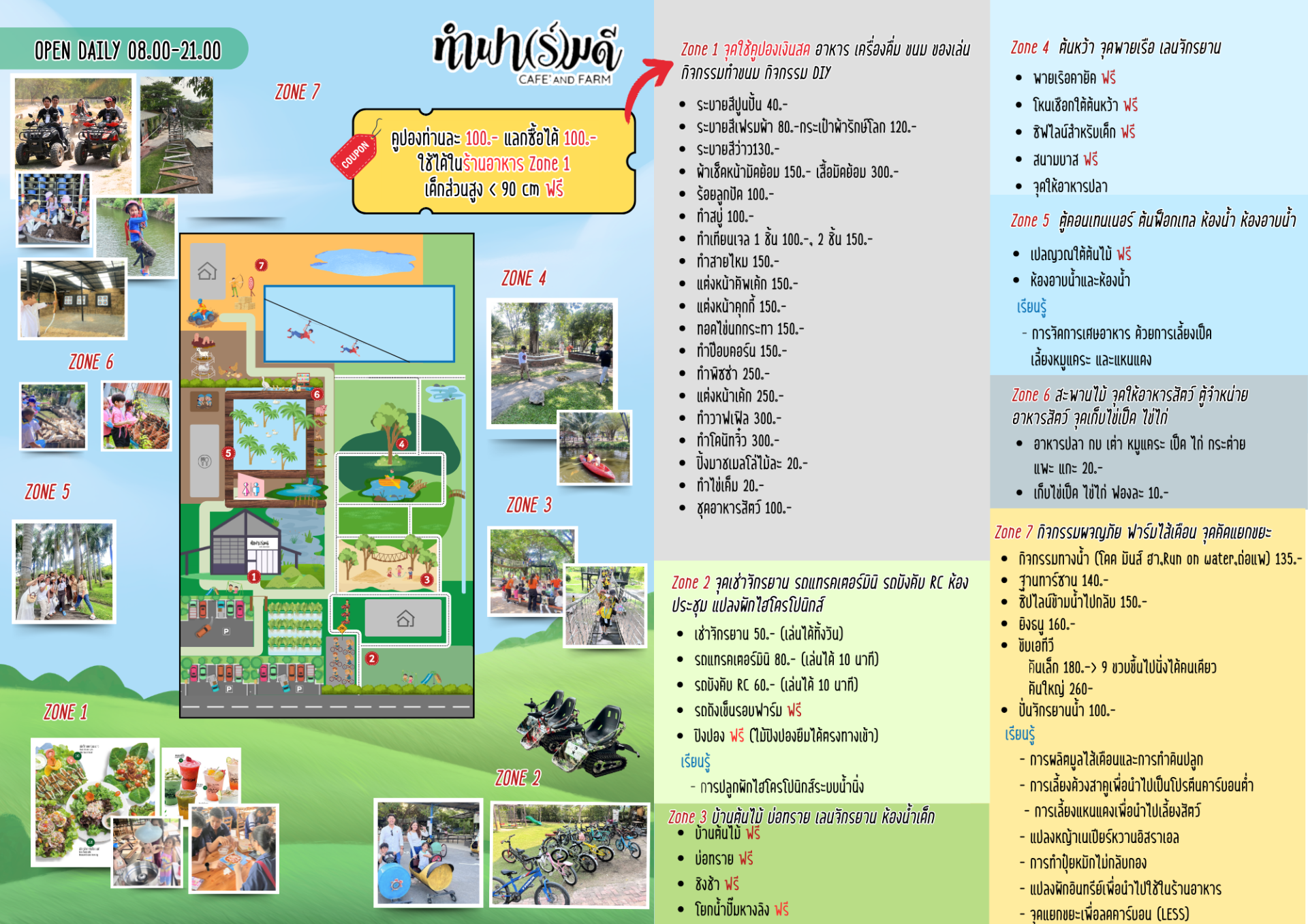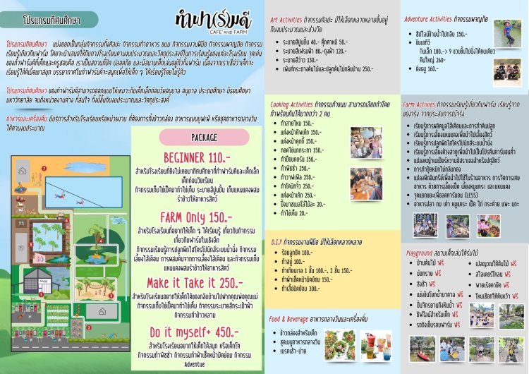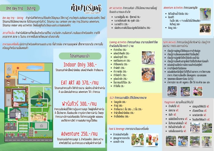 บริษัท ทำฟาร์มดี จำกัด เริ่มก่อตั้งจาก ความชอบในการพาเด็กๆไปทำกิจกรรมนอกบ้าน ให้ทุกๆวันหยุดมีความหมาย ไม่ต้องนั่งเล่นแต่มือถือ หรือ ไอแพด ตอบโจทย์คุณพ่อคุณแม่และผู้ปกครองที่ต้องการพาบุตรหลานมาปล่อยพลัง ทางฟาร์มมีกิจกรรมหลากหลาย โดยแบ่งเป็นโซนต่างทั้งหมด 7 โซน โซนแรกคือโซนที่สามารถใช้คูปองเงินสดเพื่อซื้ออาหาร เครื่องดื่ม ขนม ของเล่น กิจกรรมทำขนม กิจกรรม DIY อาทิเช่น ระบายสีปูนปั้น ตุ๊กตาหมี เฟรมผ้า ถุงผ้า ว่าว ร้อยลูกปัด ทำสบู่ ทำเทียนเจล ทำสายไหม แต่งหน้าคัพเค้ก คุกกี้ทอดไข่นกกระทา ทำป๊อบคอร์น ทำพิซซ่า ทำวาฟเฟิล ทำโดนัทจิ๋ว แต่งหน้าเค้ก ปิ้งมาชเมลโล่ ทำไข่เค็มและขายชุดอาหารสัตว์ โซนสองมีจุดเช่าจักรยาน ห้องประชุม แปลงผักไฮโดรโปนิกส์และแปลงแหนแดง โซนสามมีบ้านต้นไม้ให้เด็กๆฝึกความกล้า บ่อทราย เลนจักรยาน ห้องน้ำเด็ก โซนสี่ใต้ต้นหว้า มีจุดพายเรือ เลนจักรยาน โซนห้าบริเวณตู้คอนเทนเนอร์ ผู้ใหญ่สามารถขึ้นไปสัมผัสบรรยากาศที่รอบล้อมด้วยภูเขา ถ่ายภาพชมวิวสวยๆ มีต้นฟ็อกเทล มีสไลเดอร์โคลน ห้องน้ำ ห้องอาบน้ำ โซนหกบริเวณสะพานไม้ มีจุดให้อาหารสัตว์ ตู้จำหน่ายอาหารสัตว์ ไก่ เป็ด กระต่าย แพะ แกะ หมูแคระ ปลา และสัตว์นานาชนิด ให้ทุกคนสนุกกับการให้อาหารสัตว์ มีจุดเก็บไข่เป็ด ไข่ไก่ โซนเจ็ดมีกิจกรรมผจญภัย อาทิเช่น รถเอทีวี เล่นซิปไลน์ ยิงธนู เป็นต้น นอกจากนี้ยังมีฟาร์มไส้เดือนและกิจกรรมการเกษตรให้ได้เรียนรู้อีกมากมาย