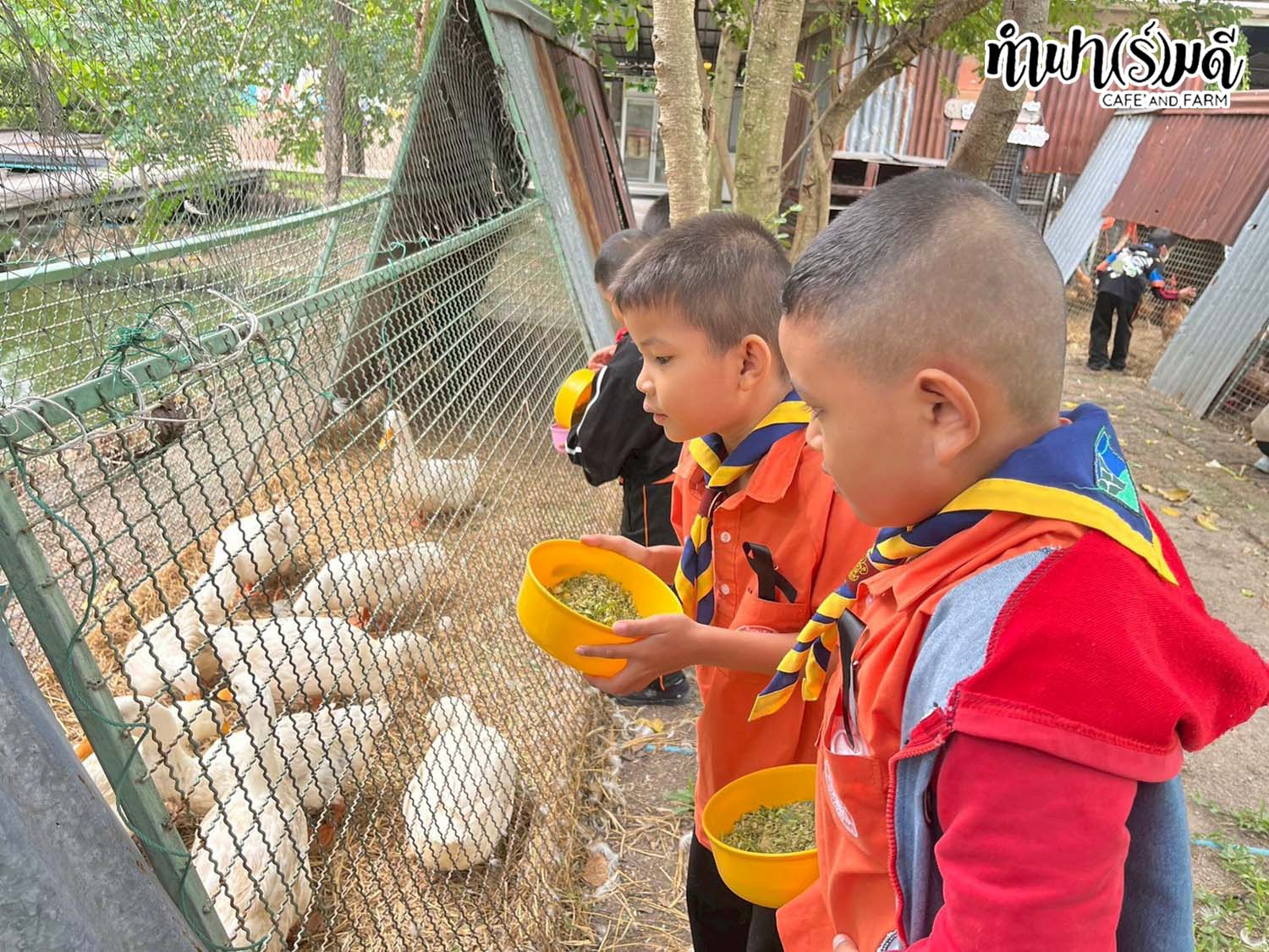 เรียนรู้การผสมอาหารสัตว์และยังได้นำอาหารที่ผสมไปป้อนน้อง ๆ สัตว์ในฟาร์มด้วย