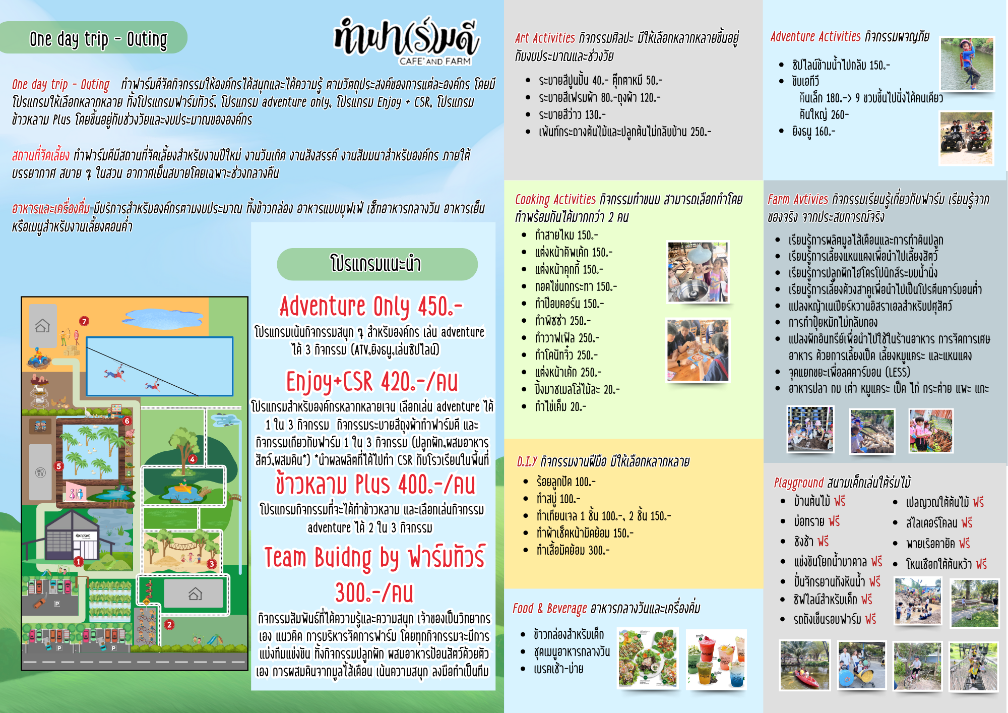 One day trip - Outing ทำฟาร์มดีจัดกิจกรรมให้องค์กรได้สนุกและได้ความรู้ ตามวัตถุประสงค์ของการแต่ละองค์กร โดยมีโปรแกรมให้เลือกหลากหลาย ทั้งโปรแกรมฟาร์มทัวร์, โปรแกรม adventure only, โปรแกรม Enjoy + CSR, โปรแกรมข้าวหลาม Plus โดยขึ้นอยู่กับช่วงวัยและงบประมาณขององค์กร